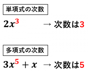 例えば、$2x^3$ の次数は $3$ です。$2\times x\times x\times x$ で文字が3つかけ合わされているとみなせるからです。